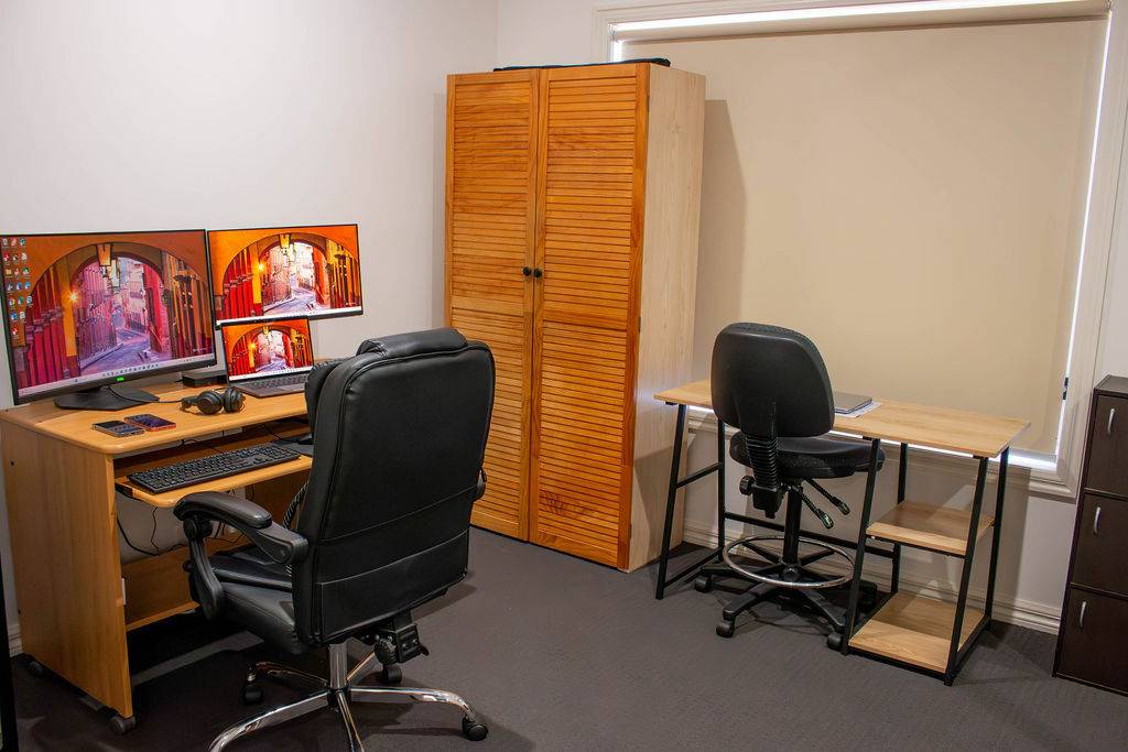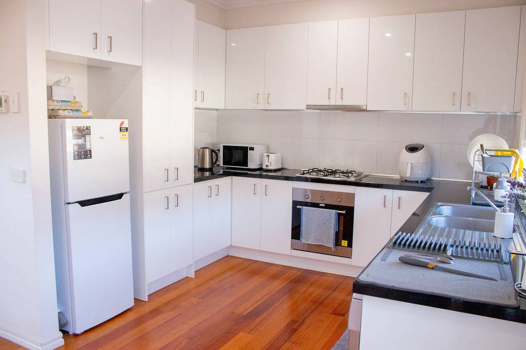The unit features three spacious bedrooms, including a master with a walk-in robe (WIR) and ensuite. A modern main bathroom is conveniently located for household use. The kitchen is beautifully designed with a gas cooktop, electric oven, dishwasher, and Caesarstone benchtops, combining style and functionality. Climate control is ensured year-round with evaporative cooling and ducted gas heating. The open-plan living area is ideal for entertaining and family gatherings.